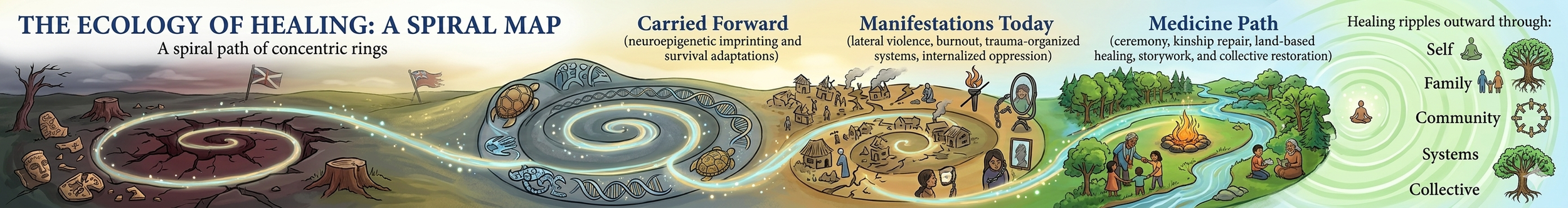 In the Chiricahua worldview, wounds are not simply damage to be repaired; they are teachers with their own spirit. Four concentric rings map the ecology of healing. We will look at the Original Wound (colonial rupture: loss of land, language, ceremony, and kinship), what is Carried Forward (neuroepigenetic imprinting and survival adaptations), Manifestations Today (lateral violence, burnout, trauma-organized systems, internalized oppression), and the Medicine Path (ceremony, kinship repair, land-based healing, storywork, and collective restoration). Healing ripples outward through self, family, community, and systems.